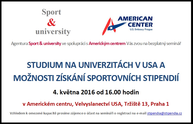 Agentura Sport&university již několik let pořádá pro všechny zájemce o studium na univerzitách v USA pravidelné semináře, kde zástupci agentury prezentují veškeré základní informace o studiu a především možnostech získání sportovních a akademických stipendií na univerzitách v USA. Jeden z těchto bezplatných seminářů se bude konat již 4.května 2016 od 16.00 v Americkém centru na Velvyslanectví USA v Praze. Semináře jsou určené pro studenty středních škol, ale také pro studenty, kteří již na vysoké škole studují a mají možnost transferovat na univerzitu do USA. Více informací najdete na stránkách agentury Sport&university www.stipendia.cz